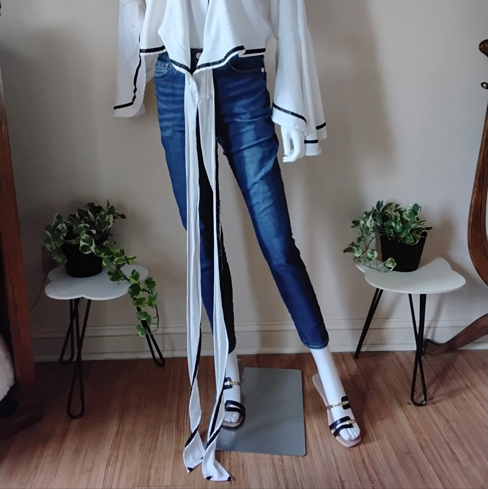 Charlotte Russe White Wrap Top - Black Trim - Flared Sleeves Size L – EUC