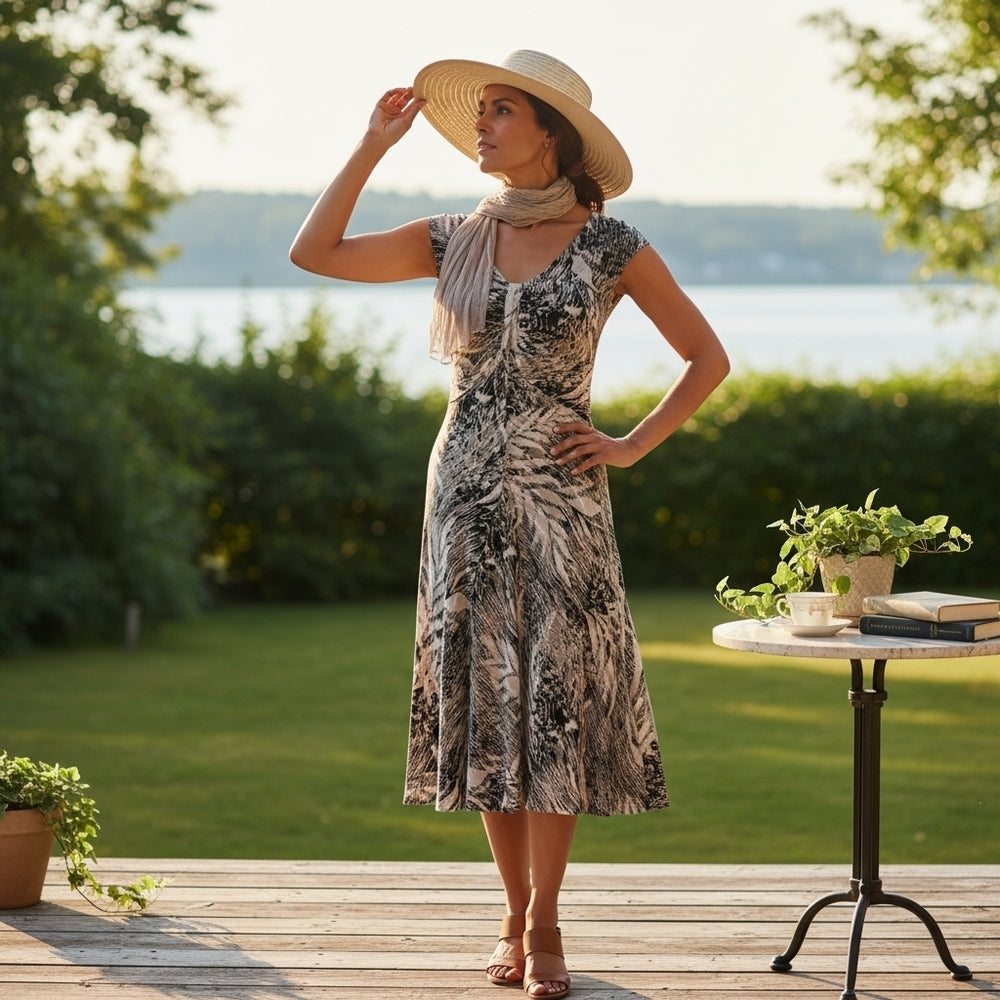 This chic Evan-Picone dress combines timeless style with everyday comfort. Featuring a bold black and brown abstract print, flattering cap sleeves, and a midi-length flared skirt, it’s designed to transition seamlessly from office to evening. The pullover style with a discreet side zip closure offers ease of wear while maintaining a polished silhouette. Lightweight polyester fabric ensures comfort and flow, making this dress a versatile staple for your wardrobe.