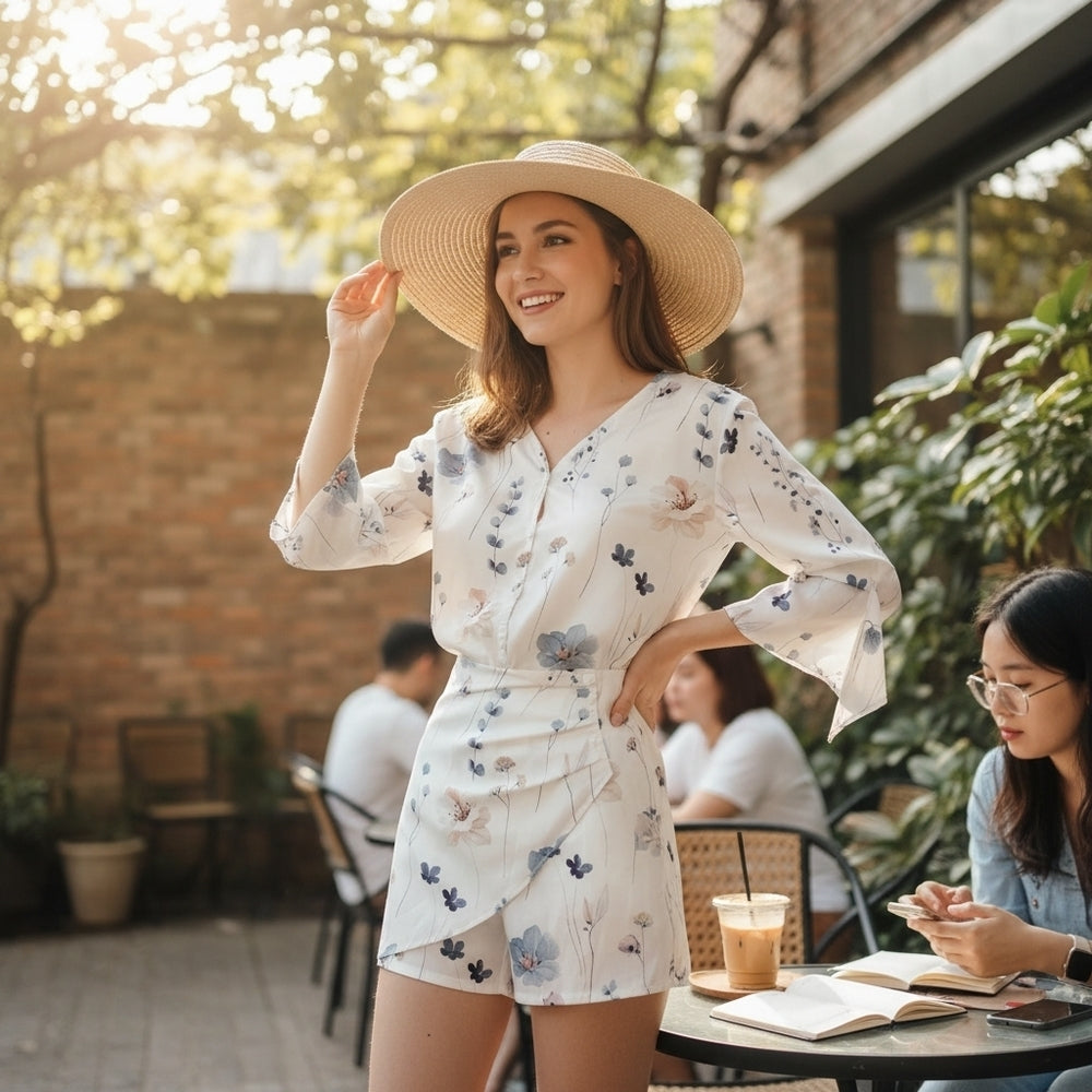 Step into effortless summer style with this chic two-piece set featuring a lightweight long-sleeve blouse and matching high-waisted skort. The white base is adorned with a soft floral print in shades of blue, pink, beige, and green, giving it a fresh, feminine vibe. The blouse has a flattering v-neckline and flowy sleeves, while the bottom offers the look of a skirt with the comfort and coverage of shorts—perfect for warm-weather outings or vacation wear.