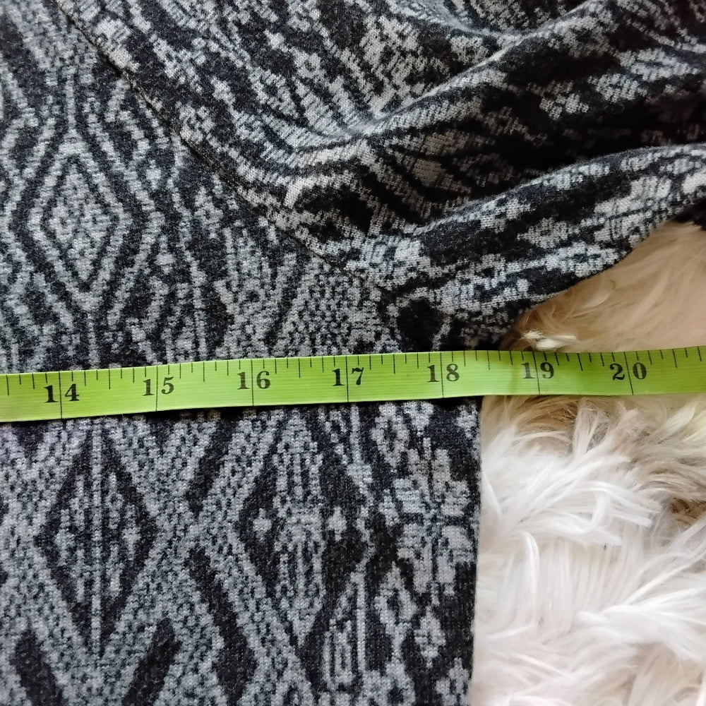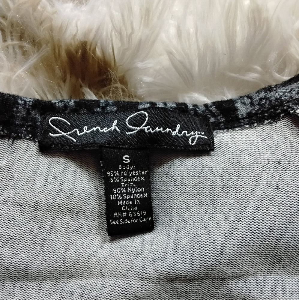Add a touch of modern charm to your wardrobe with this stylish tunic from French Laundry. Designed with a bold black and gray geometric pattern, this top features soft, velvety fabric that feels as good as it looks. The 3/4 length sleeves and slightly flared hem offer a flattering silhouette, while the lace trim adds a feminine finish.