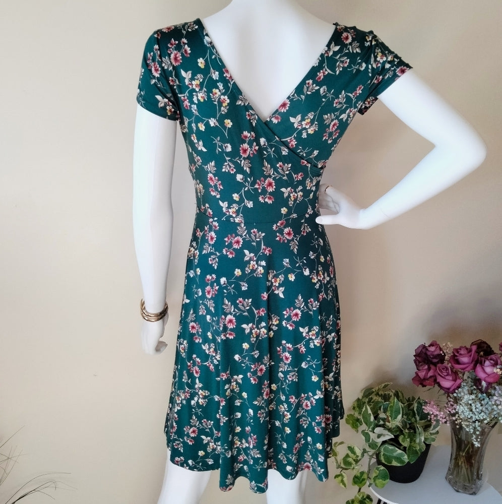 Effortlessly feminine and flattering, this Kaileigh wrap-style dress features a lush green backdrop sprinkled with delicate pink, white, and yellow florals. The V-neckline and short sleeves offer a breezy silhouette, while the fitted bodice and flared skirt create a graceful, twirl-worthy shape. Made from a soft, stretchy blend of polyester and spandex, it’s perfect for brunch dates, garden parties, or everyday wear.